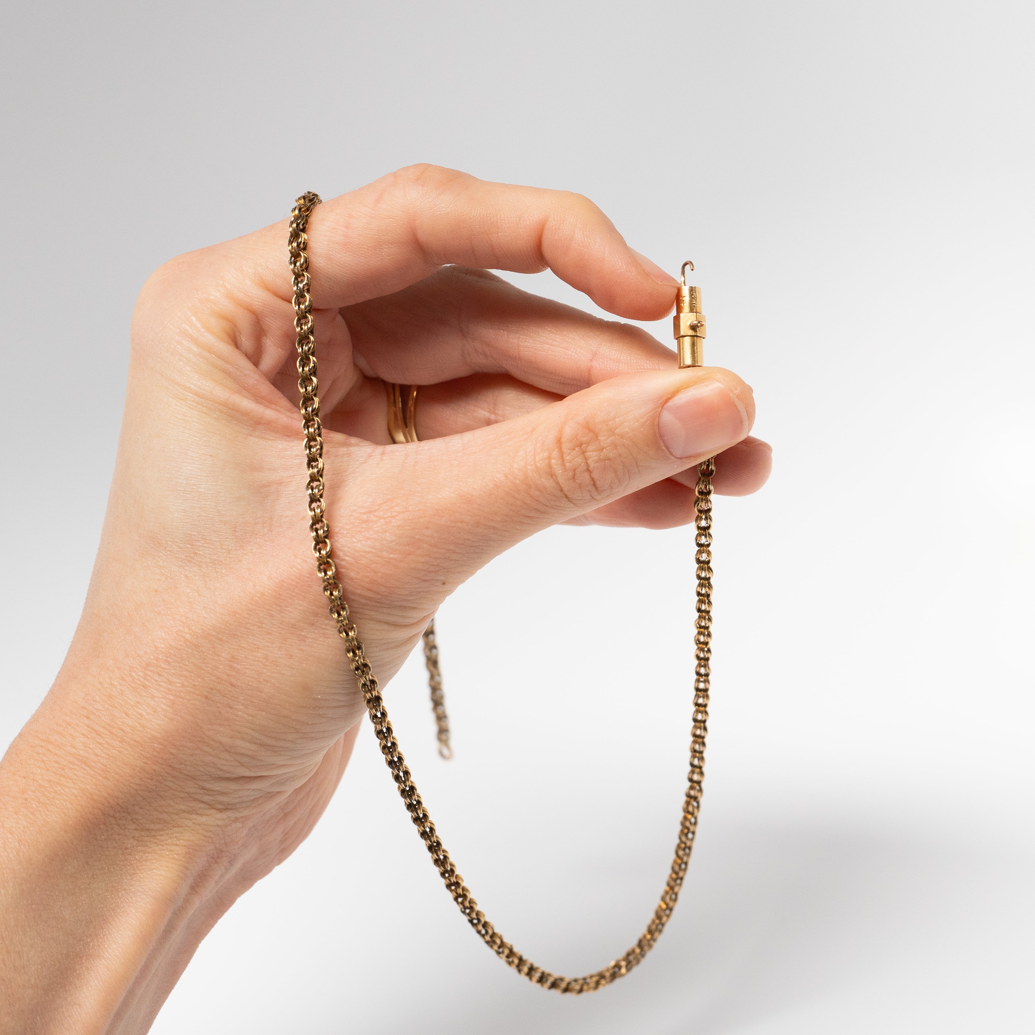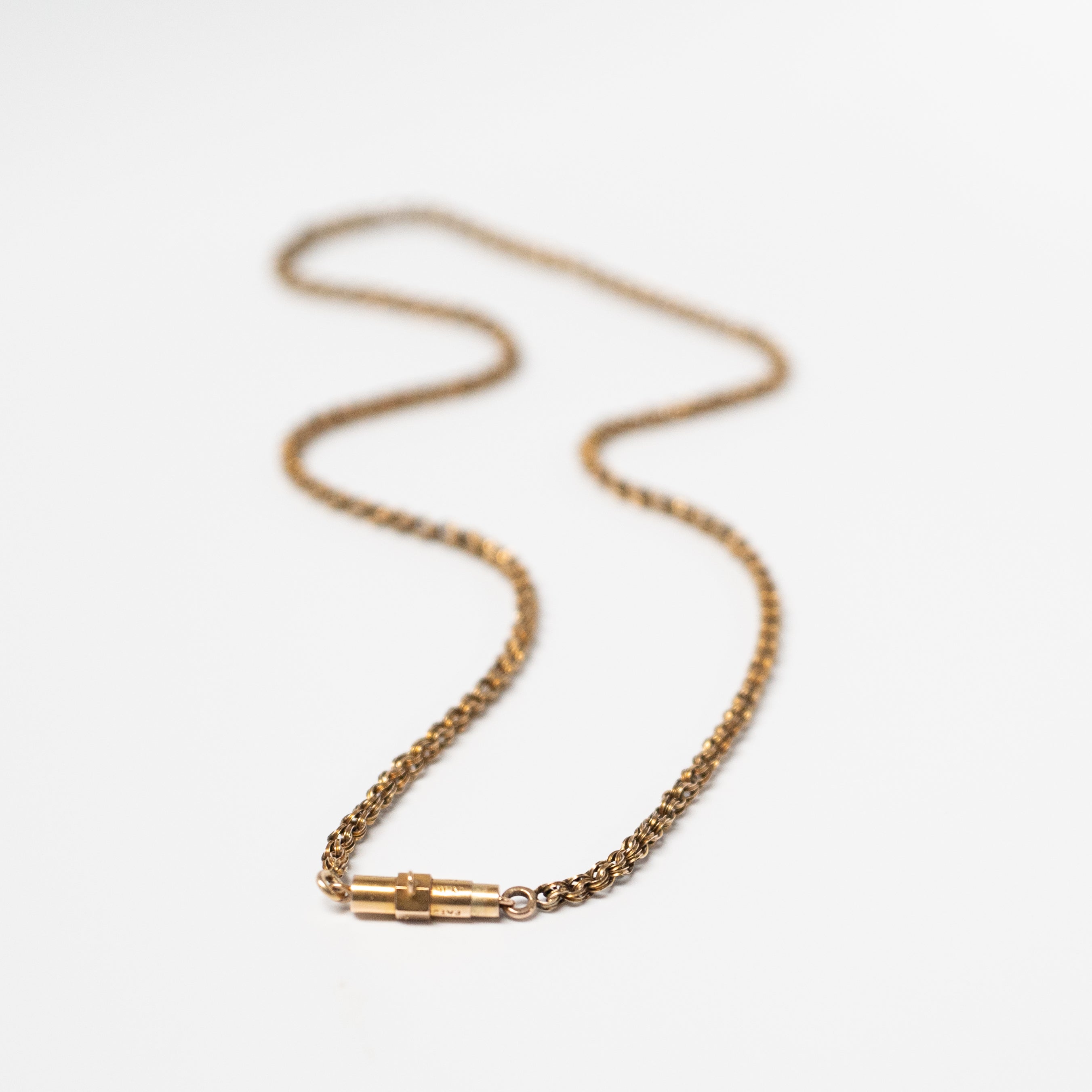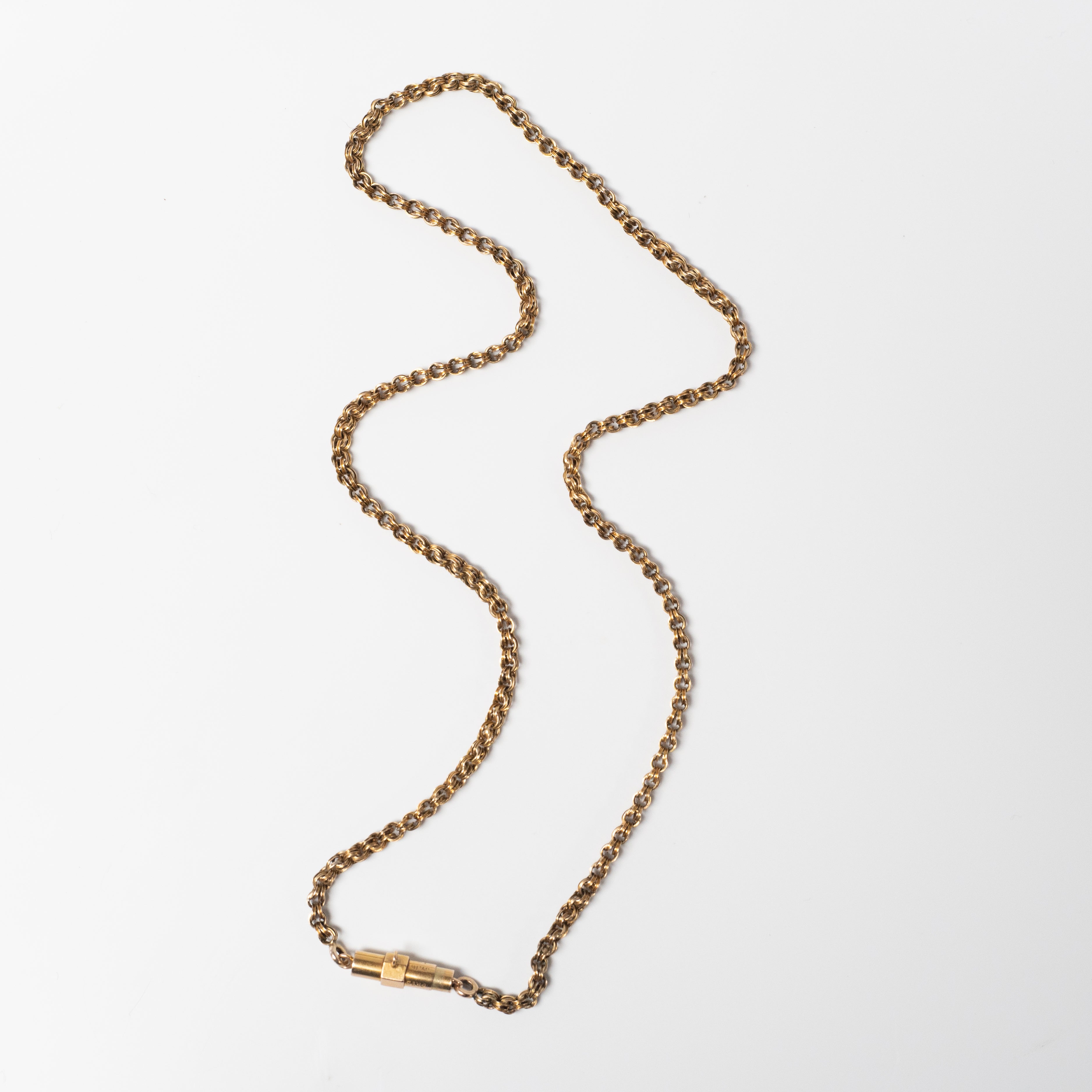 Early 20th century double-link belcher chain with closely interlocked oval links that create a rope-like texture. Finished with a secure barrel clasp, this piece has a beautiful and understated antique character.